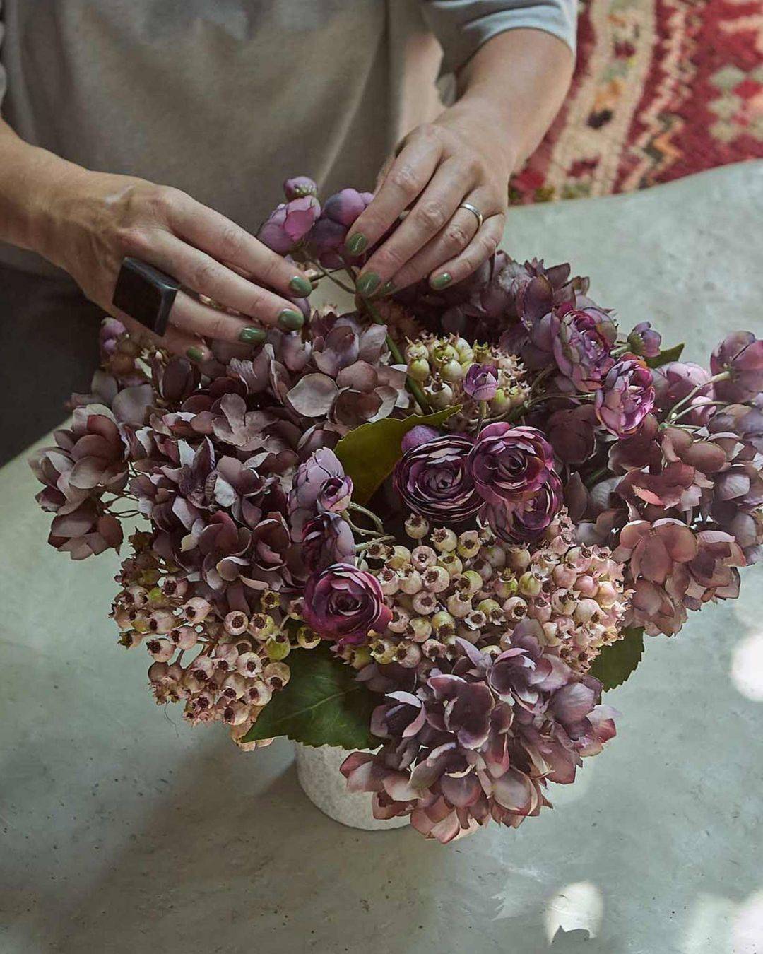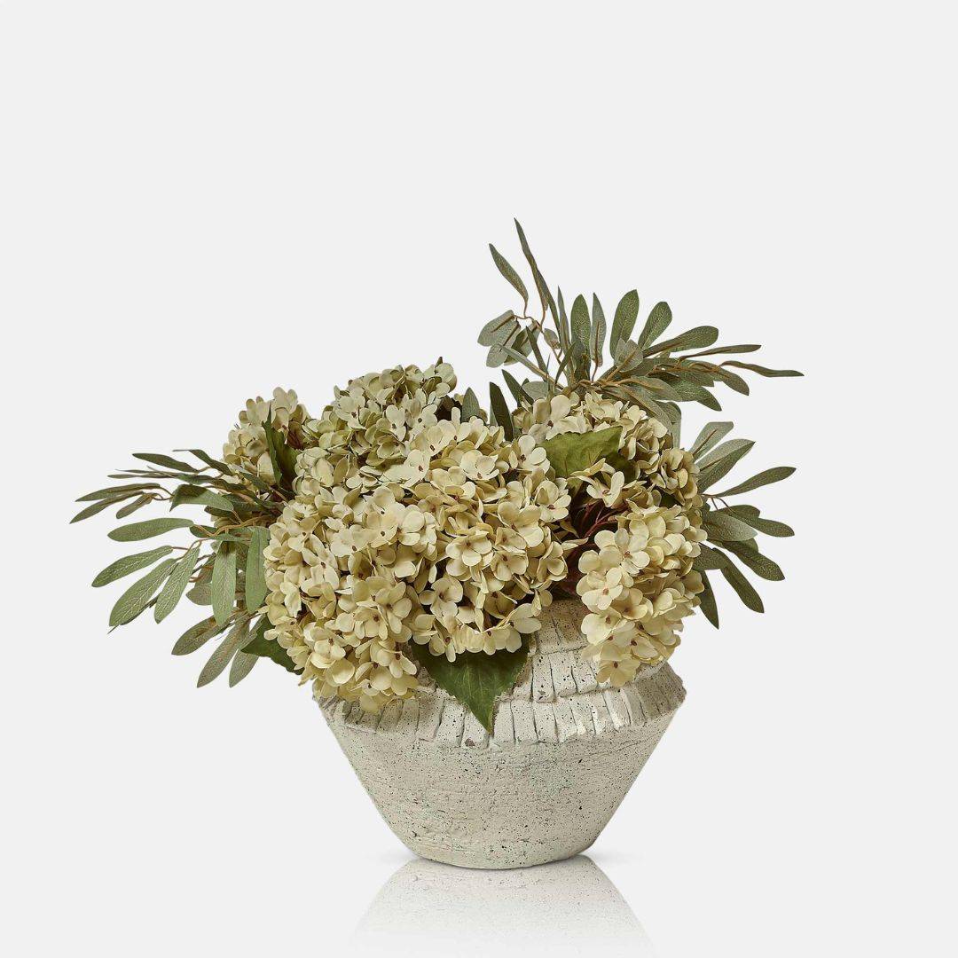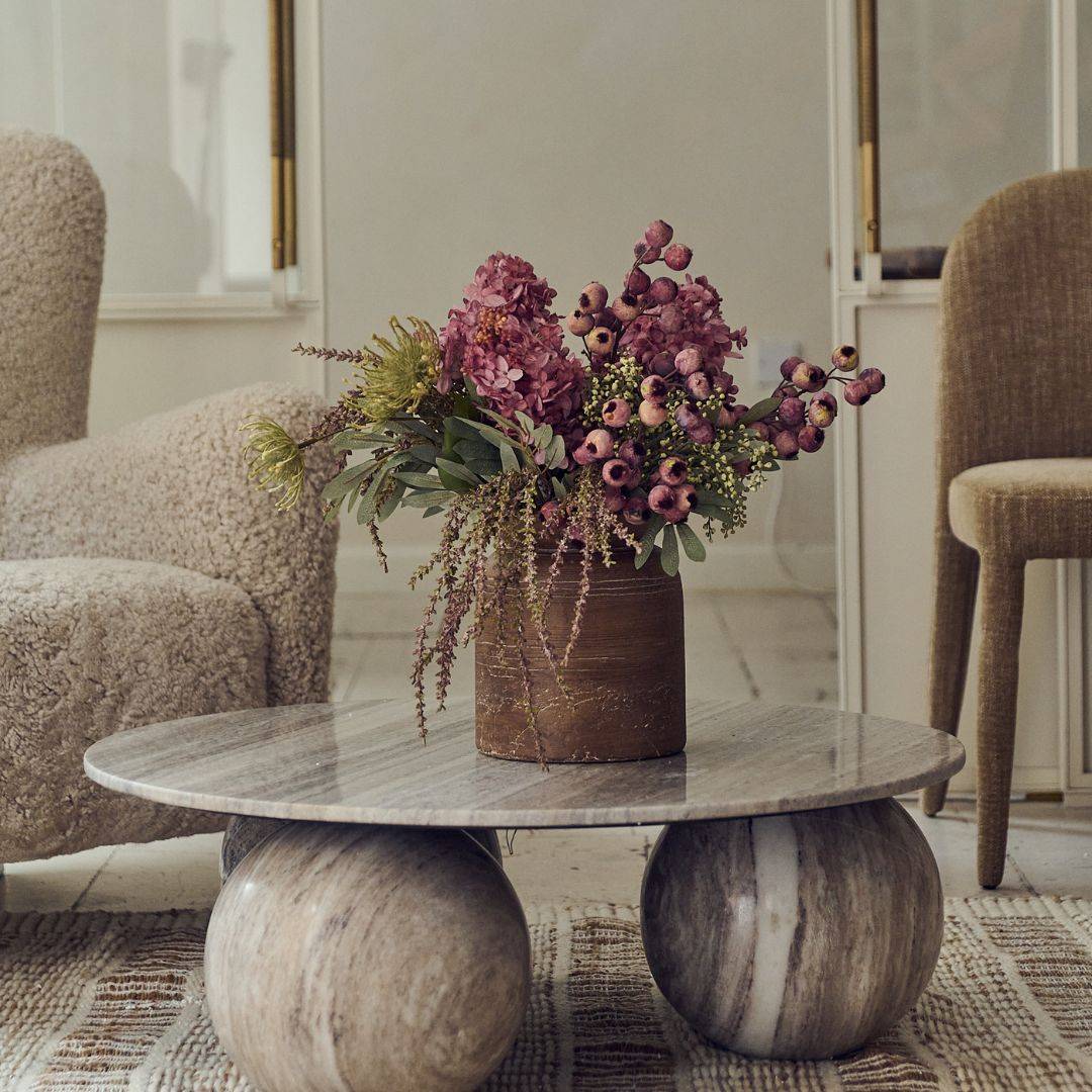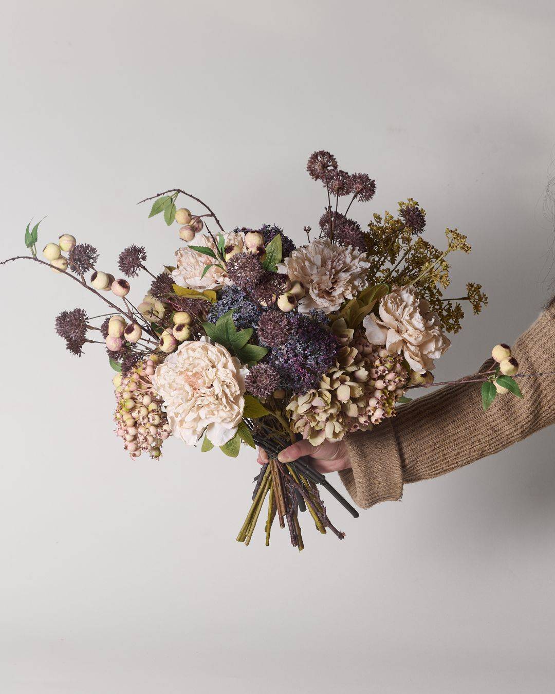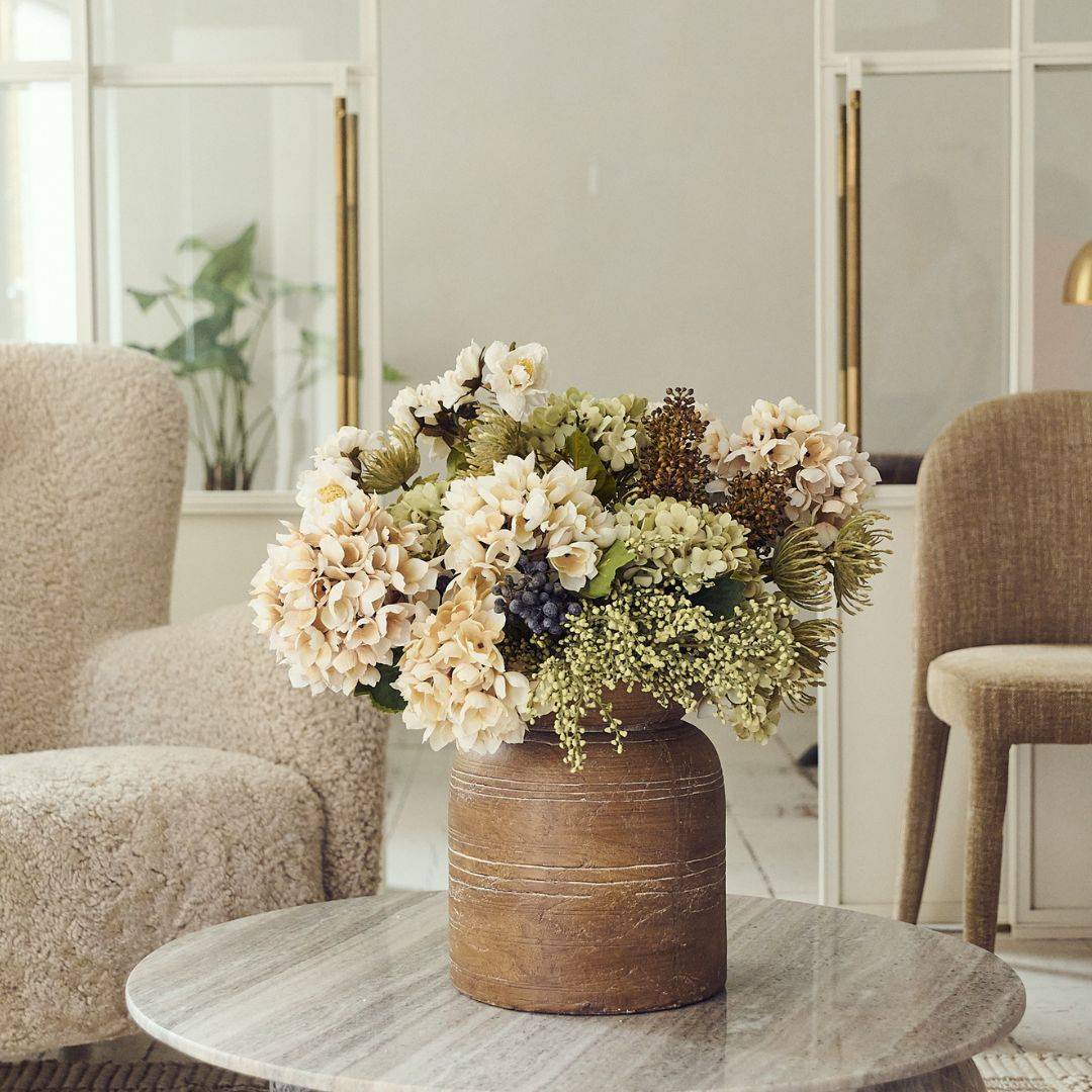 Abundant flower heads peppered with faux berries and just that perfect hint of green foliage.