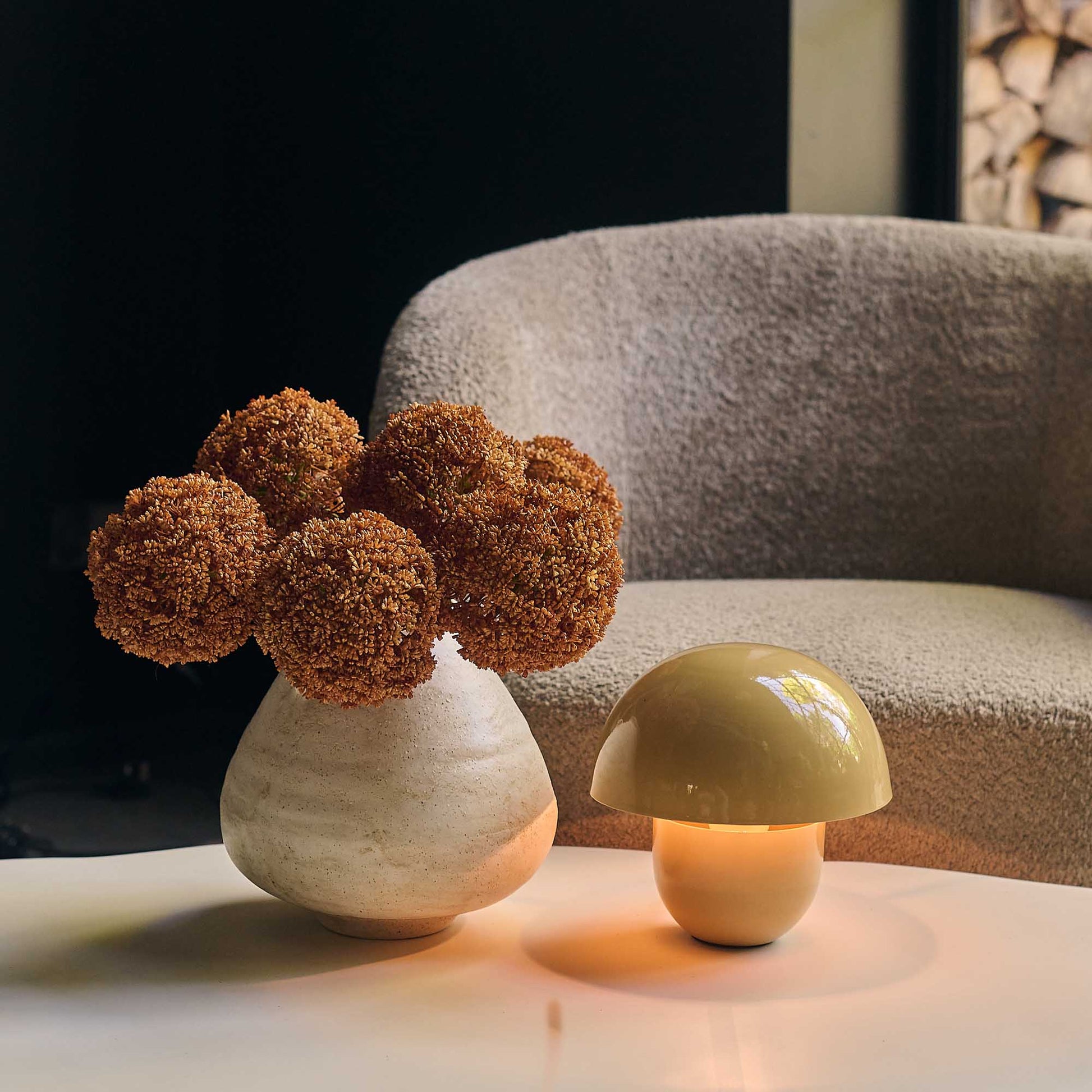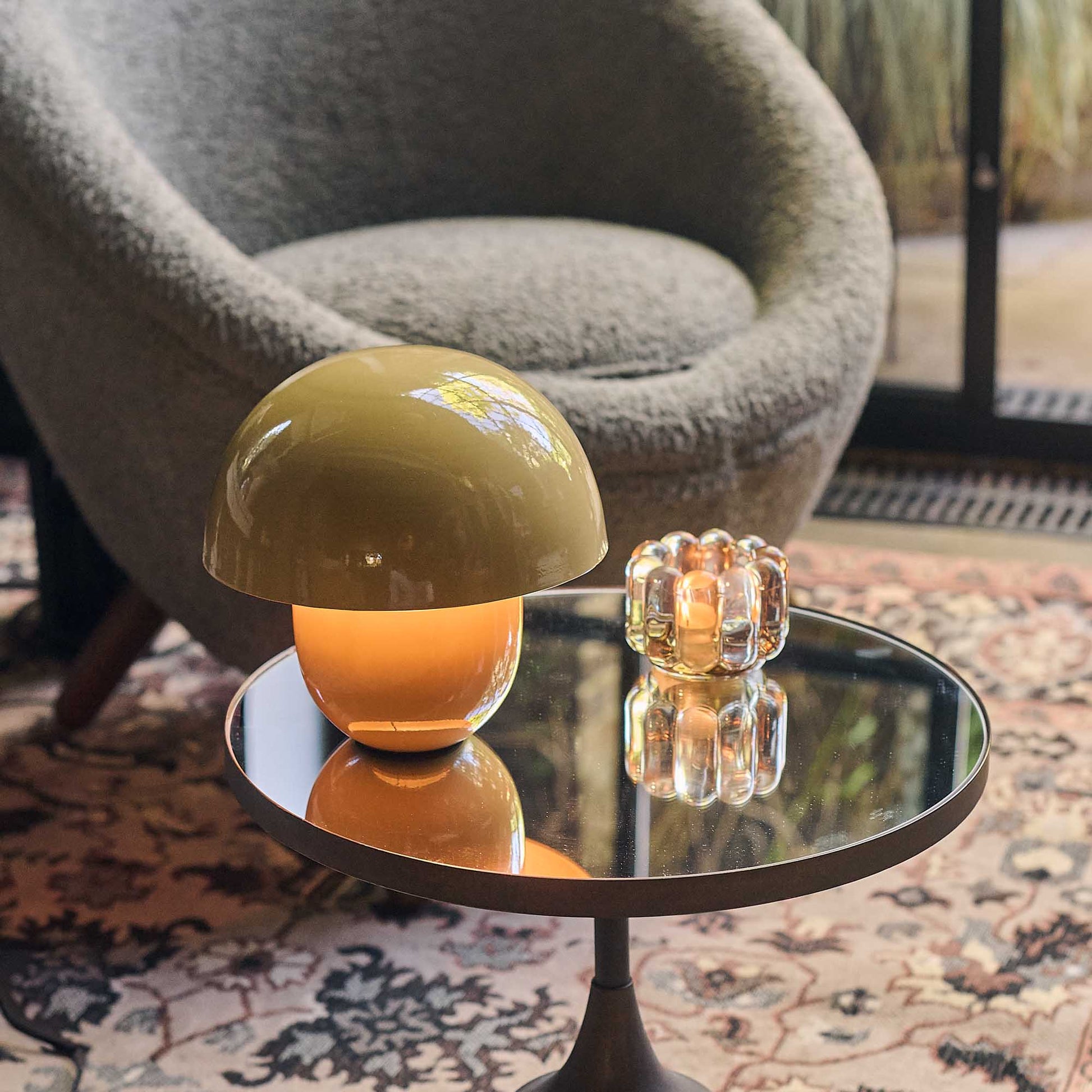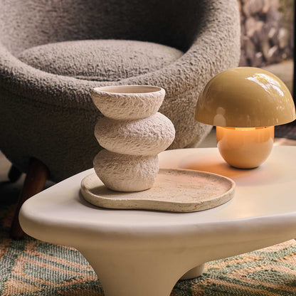 Lighting is such an essential part of perfecting the ambience in a room, and this dome table lamp introduces such a cosy glow. With its smooth metal finish and soft colour, it's super easy to style. Layer it up in a vignette with some rougher textures like a beautiful ceramic vases and sculptures, or keep it more modern and glamorous with metallic accents. We also love to add a mirror behind our lighting to really bounce the light beautifully around a room.