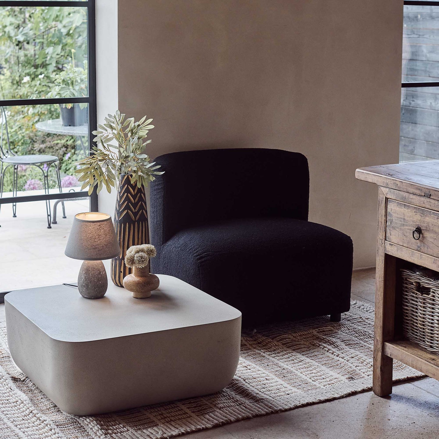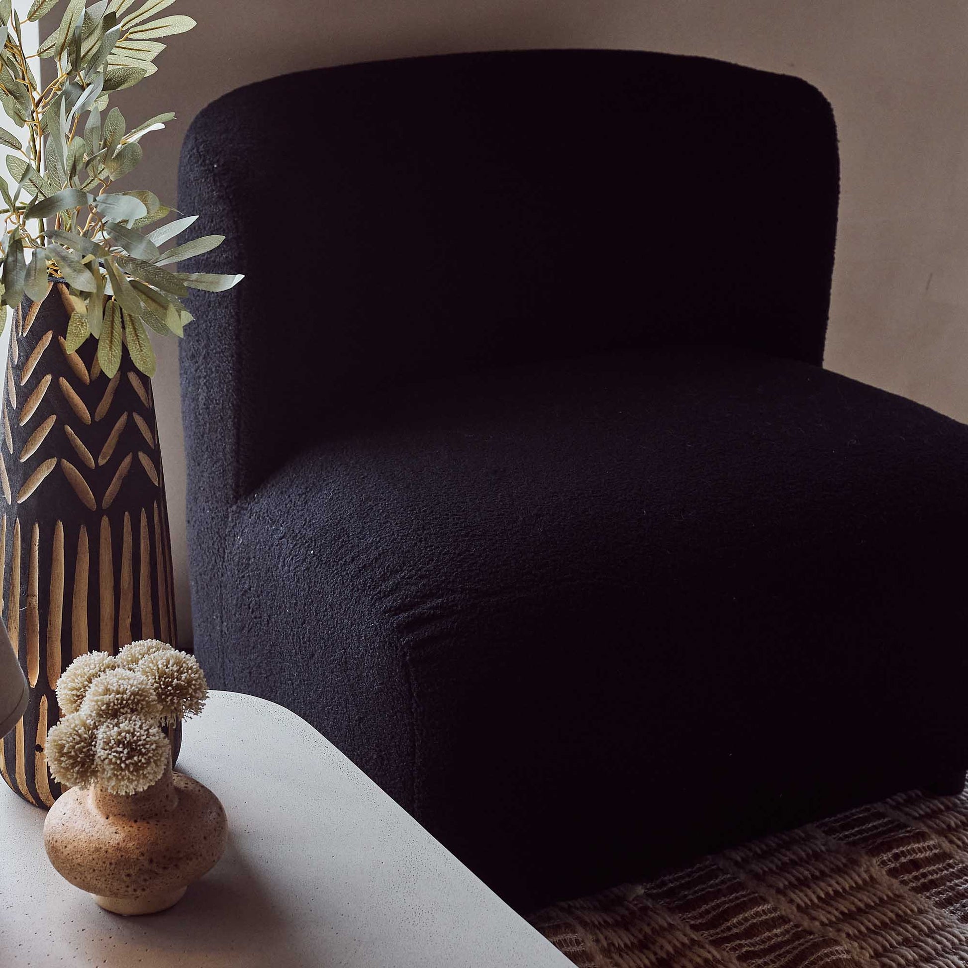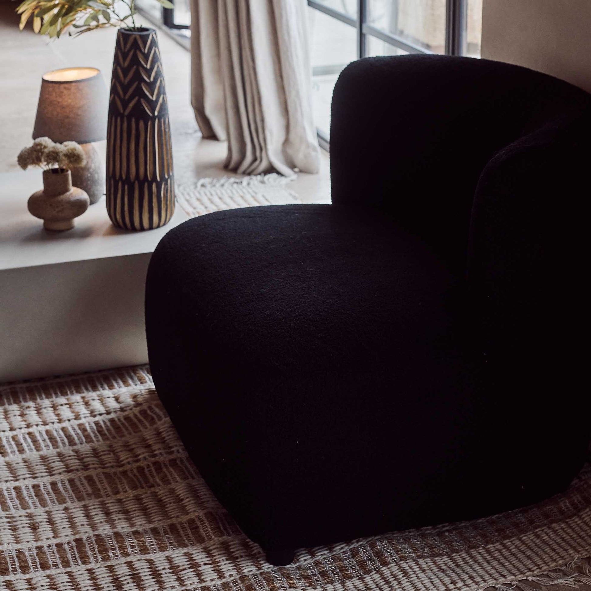 The perfect piece to add a touch of understated elegance to a room, this black accent chair captures the essence of laidback living. Upholstered in a soft black boucle fabric, this curved accent chair lends a modern and elevated feel to rooms. The neutral colour pairs well with any interior, and is the ideal base to style your favourite soft furnishings around. Slip a rug underneath it and add a convenient side table, and you've got your new favourite cosy nook.