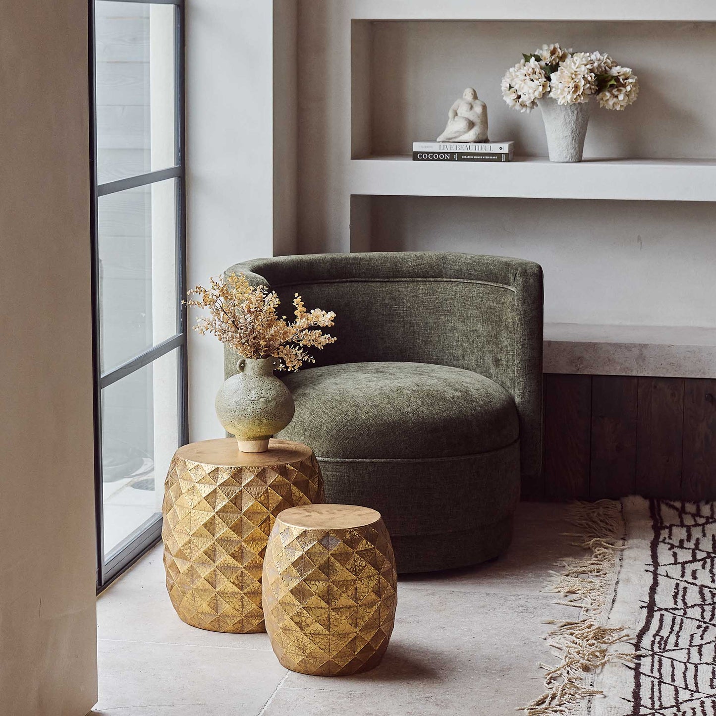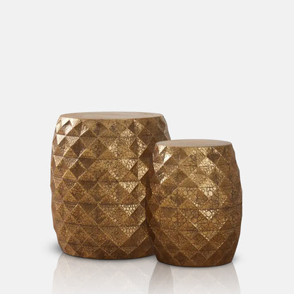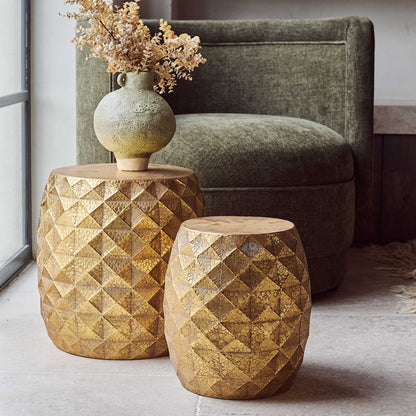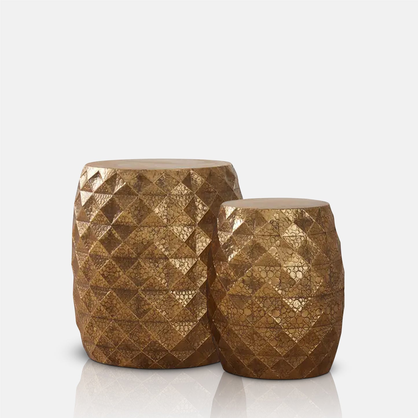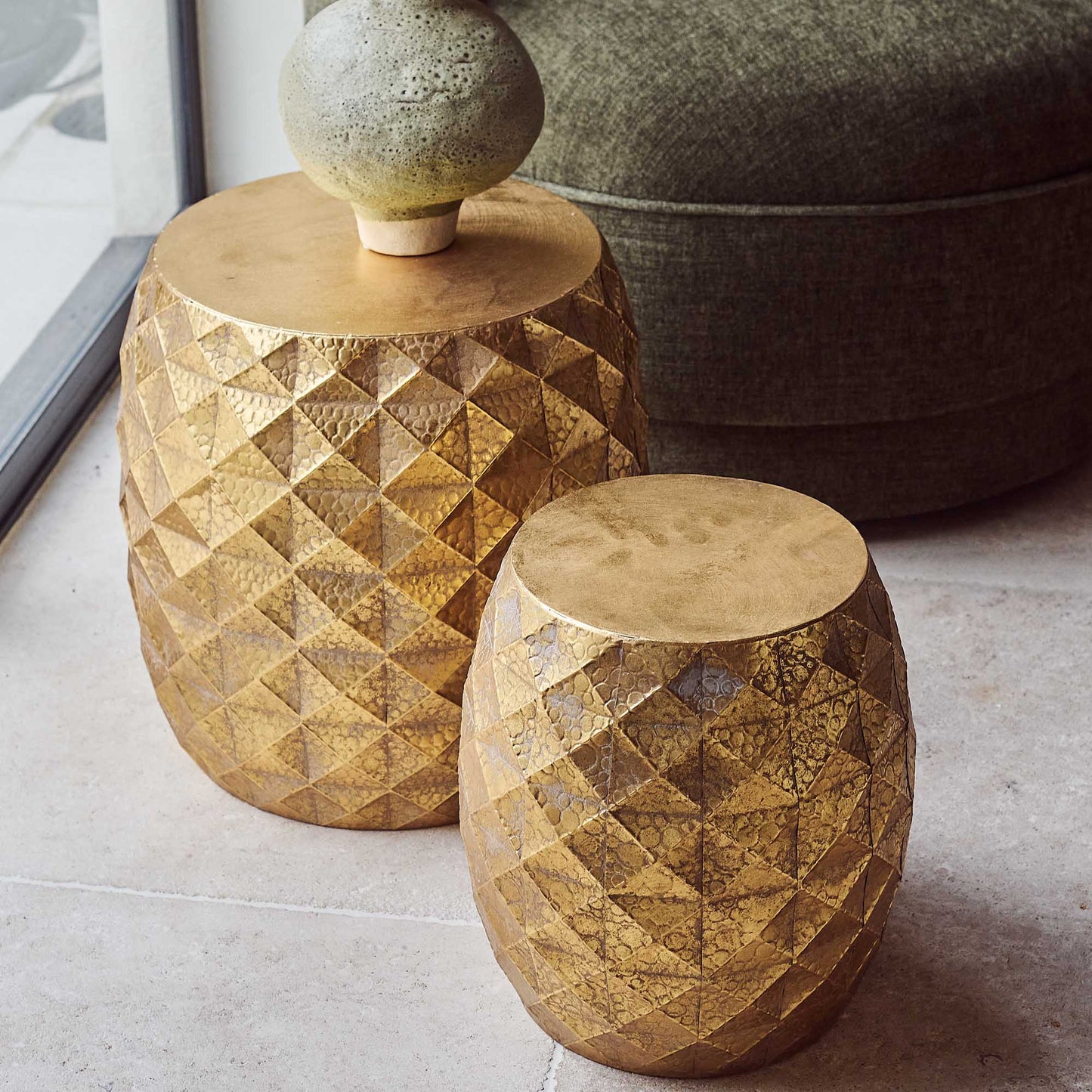 With its geometric silhouette and beautiful hammered texture, this pair of stools will bring both style and convenience to your living space. Finished in a stunning metallic hue, these gold side tables will add a luxurious and boho touch whether you style them together or separately. Set them up as a pair next to the seating in your lounge, use them in place of a coffee table, or even as an asymmetrical duo of beside tables. Create a gorgeous contrast by pairing them with more organic decor like some trailing faux plants and rustic glass candle holders.